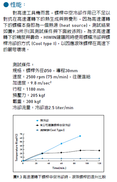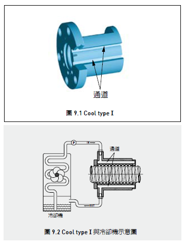 上銀滾珠絲桿,超高值Dm-N值-cool Type 1 搭配絲杠中空冷卻可得到最佳的溫控品質與精準度,此形式產品非常適合用在高速工具機和高速加工中心.cool Type 1 滾珠絲杠在螺帽內通過強制冷卻液體,以降低滾珠絲杠操作在高速運轉時的熱源產生的熱膨脹現象,以達到高速化和高精度的目的.,液體在螺帽的通道內循環流動,并與冷卻機進行熱交換作用,同時搭配絲杠中空冷卻可得到最佳的溫控品質與精準度.