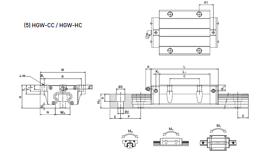 上銀直線導軌HGW55CC滑塊長166.7,寬140,是一款法蘭型重負荷上下鎖式滑塊,HGW55CC上銀滑塊上面有4個M14的螺紋孔,其孔距是95*116,滑軌加滑塊的組合高度為70,上銀直線導軌HGW55CC的固定螺絲為M14,安裝孔之間的距離為120,由于體積比較大,目前多應(yīng)用于大型機械中,例如:龍門銑,大型磨床等