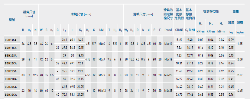 EG系列有15、20、25、30和35五種規格。是四列式低組裝線性滑軌,它使用四列鋼珠承受負荷設計,使其具備高剛性、高負荷的特性,同時具備四方向等負載特色及自動調心的功能,可吸收安裝面的轉配誤差,得到高精度的訴求。加上降低組合高度及縮短滑塊長度,非常適合高速自動化產業機械及空間要求的小型設備使用。