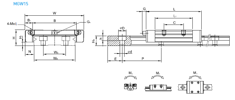 MGW15H滑塊為加長型滑塊,滑塊的大小為73.8*60,上銀滑塊MGW15H上面有4個M4的螺紋孔,孔距為45*35,導軌的安裝螺絲是M4,安裝孔距為40*23.MGW15H導軌和滑塊的組合高度為16